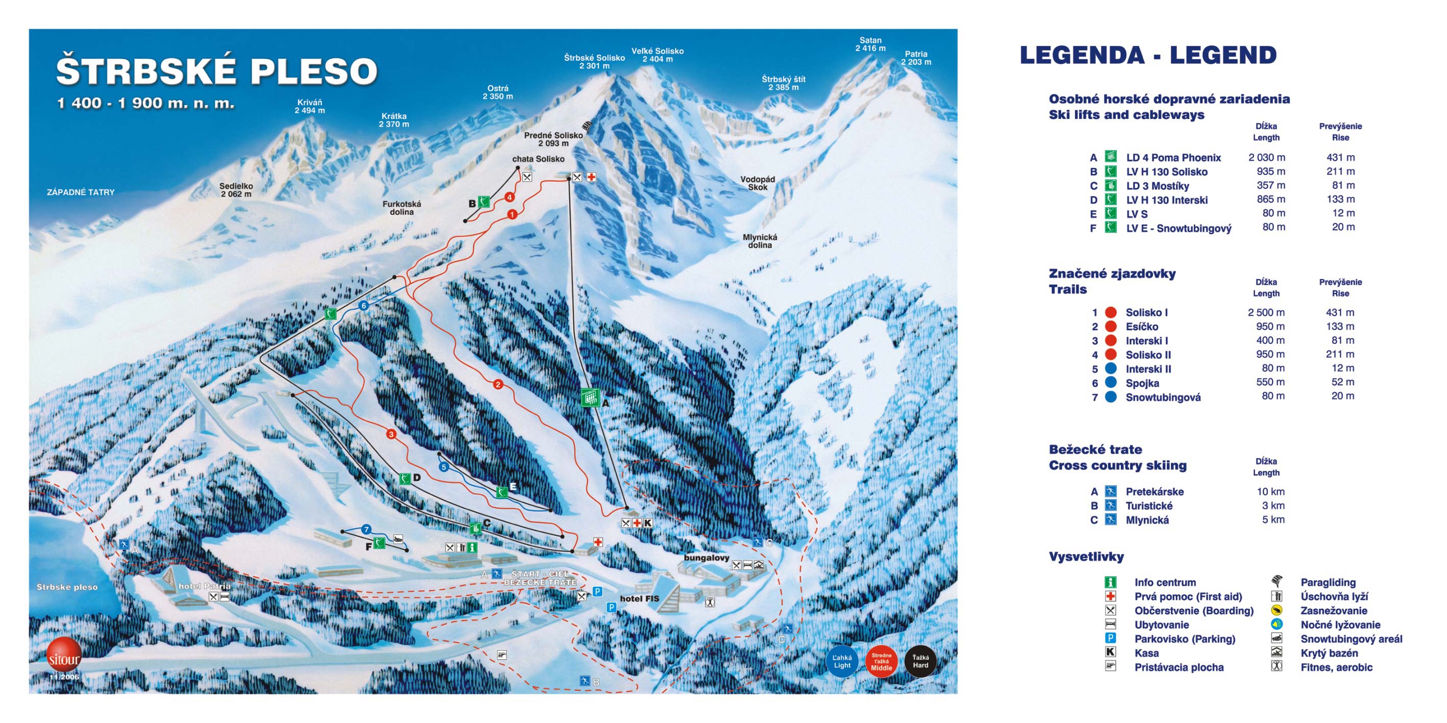 Приблизно в 1,5 км від центру курорту знаходиться добре обладнана сучасна лижна станція, що включає два трампліни для стрибків (70 м і 90 м), «старт» і «фініш», лижних гонок на 5, 10, 15, 30 і 50 км, та два стадіони з трибунами для глядачів.Гірськолижний відпочинок у Штребське Плесо проходить поруч зі станцією, на висотах від 1400 до 1840 м над рівнем моря. Тут прокладено добре підготовлені гірськолижні траси для початківців та професіоналів, які обслуговують 2 крісельні, 3 бугельні та один дитячий підйомник. Висота курорту:1346м. Тривалість сезону: з початку грудня до кінця квітня, близько 140 днів. Перепад висот: 1376м; 1840м. Протяжність, всього: 8.30км.: Сині 2.70 км-33%; червоні 5.60 км-67%. Найдовша траса: 2.00 км. Підйомників, всього . На гірськолижному курорті Штребське Плесо є все необхідне для повноцінного відпочинку: комфортабельні готелі, басейни, сауна, тренажерні зали, ковзанка, ресторани зі словацькою та європейською кухнями, кафе, дискотеки, казино. У місті працюють універмаг, відділення банку, пошта, аптека тощо. Товариство «Сітоур» спільно з асоціацією експлуатаційників канатних доріг «ЛАВЕКС» кожні три роки оцінює рівень технічного оснащення лижних центрів, догляду за схилами гір, якість послуг та, не в останню чергу, ступінь безпеки та охорони лижників. При останній інспекції з огляду на суворі критерії перевірених європейських норм, вони присудили цьому курорту 5 зірочок (за п'ятибальною шкалою).