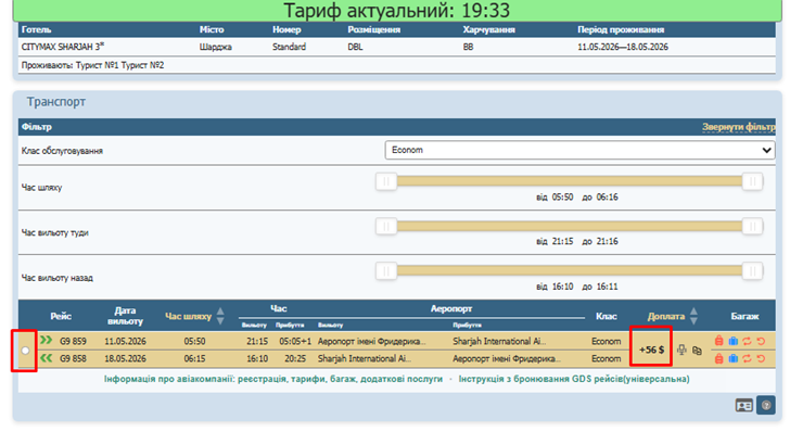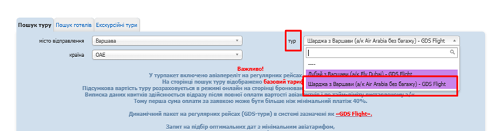 Заходимо в пошук турів по напрямку та вибираємо відпов ідний тур із позначкою «а/к Air Arabia GDS Flight».