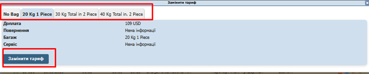 Щоб змінити тариф та багаж, необхідно натиснути кнопку "Замінити тариф "