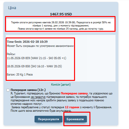 Щоб відобразити остаточну вартість туру (з урахуванням обраного рейсу та додаткових послуг), необхідно внизу натиснути кнопку «Перерахувати» (це можна робити до введення паспортних даних туристів).