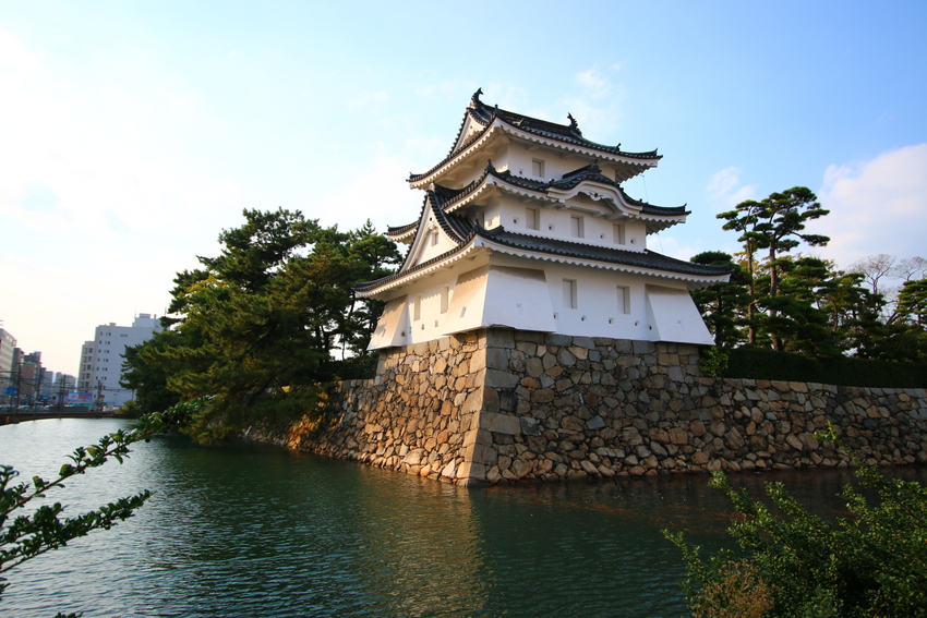 Замок Такамацу, также известный как замок Тамамо, был построен в 1590 году на побережье Японского моря Сето. Это - один из немногих японских замков, построенных вдоль береговой линии и показывает морские рвы, которые тянутся непосредственно из моря. Замком первоначально управлял клан Икома, который жил в замке на протяжении 54 лет, а затем был отдан родственникам сегуна Токугава клану Мацудайра, которые держали область под своим контролем до конца периода Эдо. Во время периода Мейдзи замок был разрушен, но в настоящее время восстанавливается. Некоторые оригинальные построки замка сохранились до наших дней в парке замка. Помимо рвов и стен, все еще стоят ворота Асахимон и две башенки, Уситора Ягуро и Цукими Ягура. В стенах замка посетители могут наслаждаться хорошо сохраненными садами. В центре парка расположено здание Хиункаку с большими комнатами татами. Построенный в 1917 как место жительства и правительственный офис, это здание используется сегодня в качестве выставочного зала и места, где проводится чайная церемония и уроки икебаны.